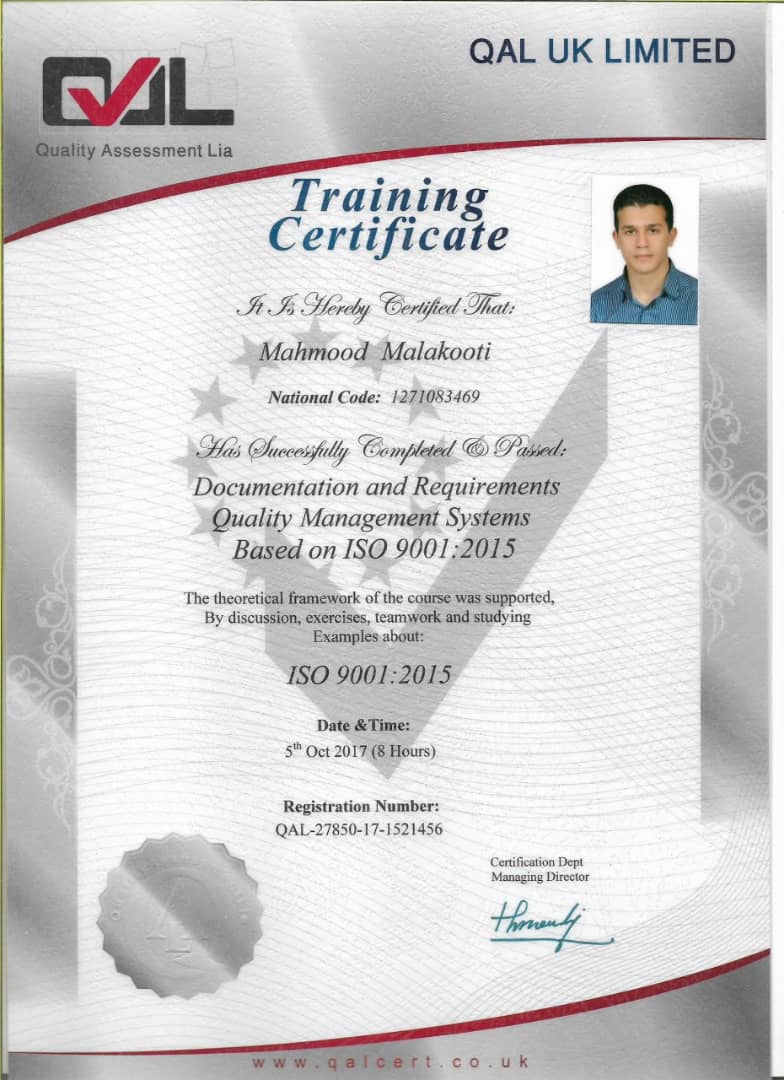 این شرکت در جهت نیل به کسب رضایت مشتریان و بهبود مستمر در انجام امور، علاوه بر ارتقای نظام تضمین کیفیت بر پایه استاندارد مدیـریت کیفیت ایران توانست در سال ۱۳۸۷ با کوشش و تلاش بی وقفه استاندارد ISO 9001/2000 در مدیریت کیفیت را مستـقر و گواهینامه آن را اخذ نماید.