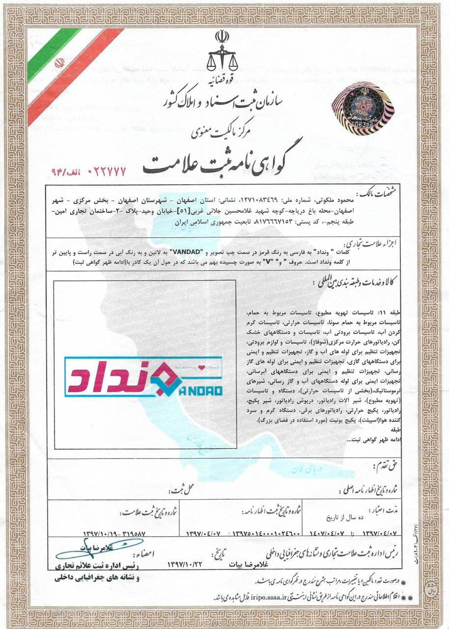 شرکت ونداد تهویه سپهر دارنده استاندارد 10002 رضایتمندی مشتری و همچنین استاندارد 9001 از آکادمی QAL انگلستان می باشد. همچنین دارای گواهی ثبت برند تحت نام تجاری ونداد می باشد.